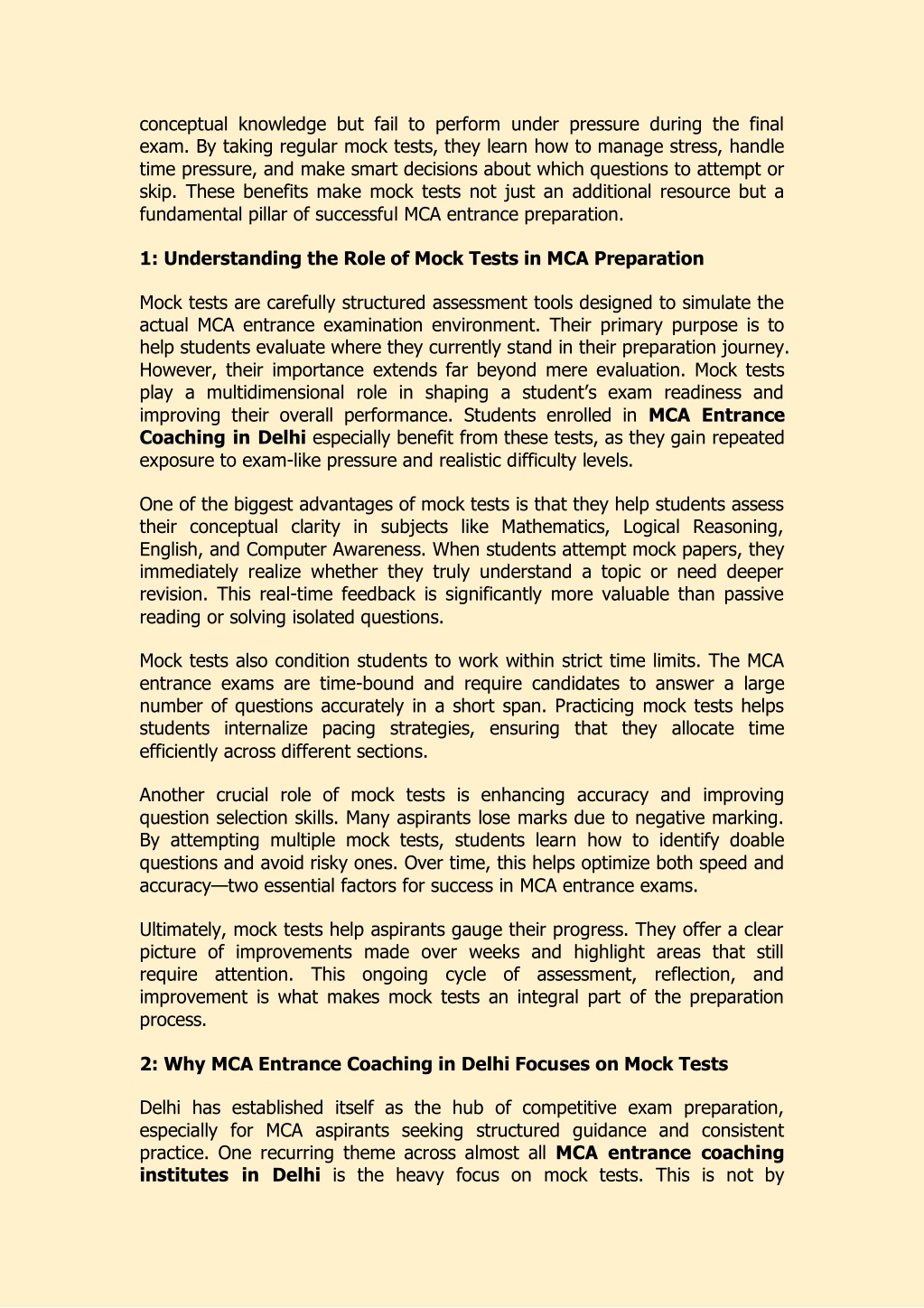 conceptual knowledge but fail to perform under pressure during the final exam. By taking regular mock tests, they learn how to manage stress, handle time pressure, and make smart decisions about which questions to attempt or skip. These benefits make mock tests not just an additional resource but a fundamental pillar of successful MCA entrance preparation. 1: Understanding the Role of Mock Tests in MCA Preparation Mock tests are carefully structured assessment tools designed to simulate the actual MCA entrance examination environment. Their primary purpose is to help students evaluate where they currently stand in their preparation journey. However, their importance extends far beyond mere evaluation. Mock tests play a multidimensional role in shaping a student’s exam readiness and improving their overall performance. Students enrolled in MCA Entrance Coaching in Delhi especially benefit from these tests, as they gain repeated exposure to exam-like pressure and realistic difficulty levels. One of the biggest advantages of mock tests is that they help students assess their conceptual clarity in subjects like Mathematics, Logical Reasoning, English, and Computer Awareness. When students attempt mock papers, they immediately realize whether they truly understand a topic or need deeper revision. This real-time feedback is significantly more valuable than passive reading or solving isolated questions. Mock tests also condition students to work within strict time limits. The MCA entrance exams are time-bound and require candidates to answer a large number of questions accurately in a short span. Practicing mock tests helps students internalize pacing strategies, ensuring that they allocate time efficiently across different sections. Another crucial role of mock tests is enhancing accuracy and improving question selection skills. Many aspirants lose marks due to negative marking. By attempting multiple mock tests, students learn how to identify doable questions and avoid risky ones. Over time, this helps optimize both speed and accuracy—two essential factors for success in MCA entrance exams. Ultimately, mock tests help aspirants gauge their progress. They offer a clear picture of improvements made over weeks and highlight areas that still require attention. This ongoing cycle of assessment, reflection, and improvement is what makes mock tests an integral part of the preparation process. 2: Why MCA Entrance Coaching in Delhi Focuses on Mock Tests Delhi has established itself as the hub of competitive exam preparation, especially for MCA aspirants seeking structured guidance and consistent practice. One recurring theme across almost all MCA entrance coaching institutes in Delhi is the heavy focus on mock tests. This is not by