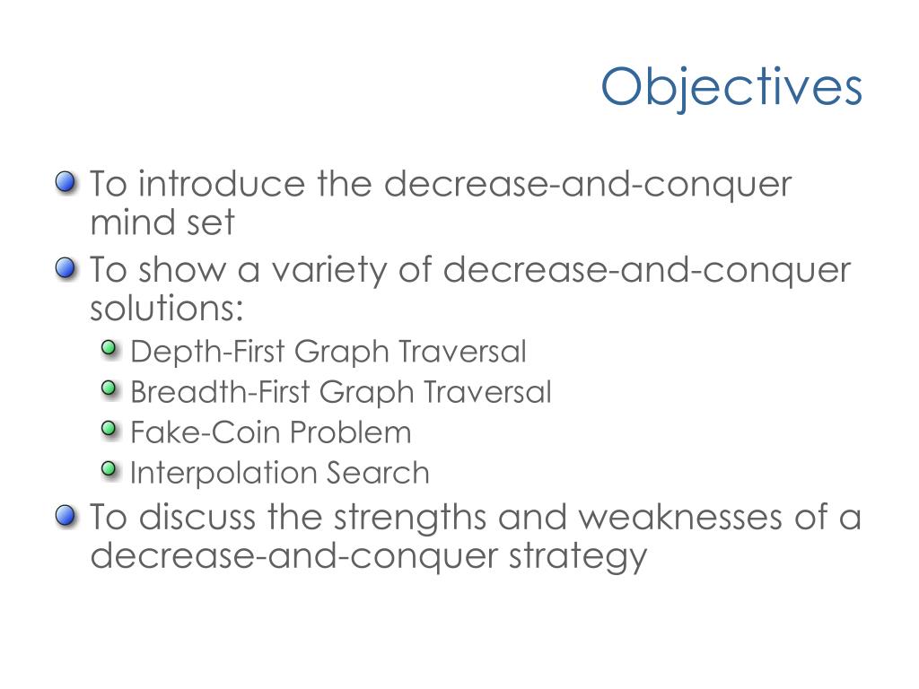 Objectives • To introduce the decrease-and-conquer mind set • To show a variety of decrease-and-conquer solutions: • Depth-First Graph Traversal • Breadth-First Graph Traversal • Fake-Coin Problem • Interpolation Search • To discuss the strengths and weaknesses of a decrease-and-conquer strategy