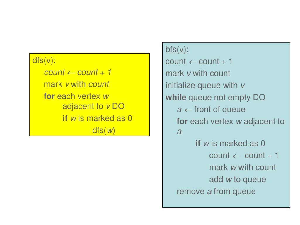 bfs(v): count count + 1 mark v with count initialize queue with v while queue not empty DO a front of queue for each vertex w adjacent to a ifw is marked as 0 count count + 1 mark w with count add w to queue remove a from queue dfs(v): count count + 1 mark v with count for each vertex w adjacent to vDO ifw is marked as 0 dfs(w)