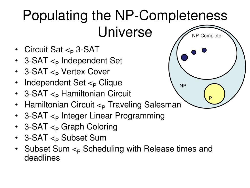 Populating the NP-Completeness Universe NP-Complete • Circuit Sat <P 3-SAT • 3-SAT <P Independent Set • 3-SAT <P Vertex Cover • Independent Set <P Clique • 3-SAT <P Hamiltonian Circuit • Hamiltonian Circuit <P Traveling Salesman • 3-SAT <P Integer Linear Programming • 3-SAT <P Graph Coloring • 3-SAT <P Subset Sum • Subset Sum <P Scheduling with Release times and deadlines NP P
