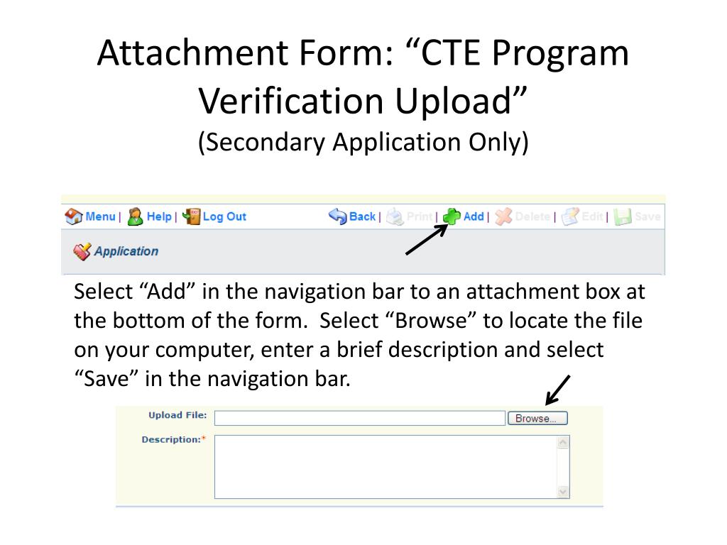 Attachment Form: “CTE Program Verification Upload” (Secondary Application Only) Select “Add” in the navigation bar to an attachment box at the bottom of the form. Select “Browse” to locate the file on your computer, enter a brief description and select “Save” in the navigation bar.