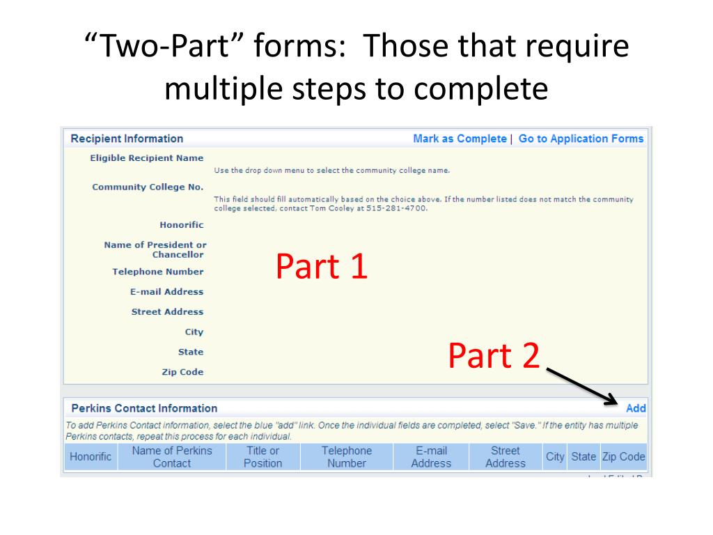 “Two-Part” forms: Those that require multiple steps to complete Part 1 Part 2
