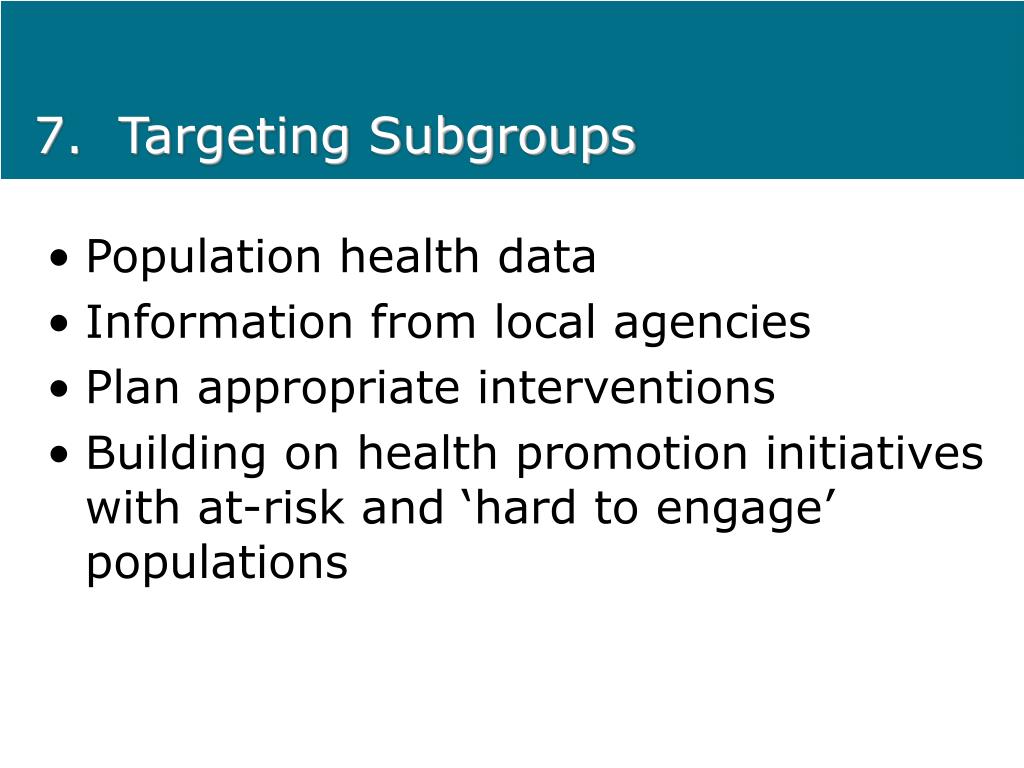 7. Targeting Subgroups • Population health data • Information from local agencies • Plan appropriate interventions • Building on health promotion initiatives with at-risk and ‘hard to engage’ populations