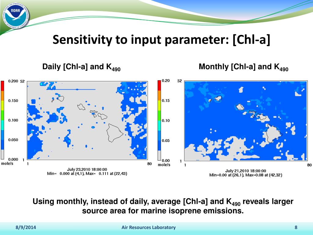 Sensitivity to input parameter: [Chl-a] Daily [Chl-a] and K490 Monthly [Chl-a] and K490 Using monthly, instead of daily, average [Chl-a] and K490 reveals larger source area for marine isoprene emissions. 8/9/2014 Air Resources Laboratory 8
