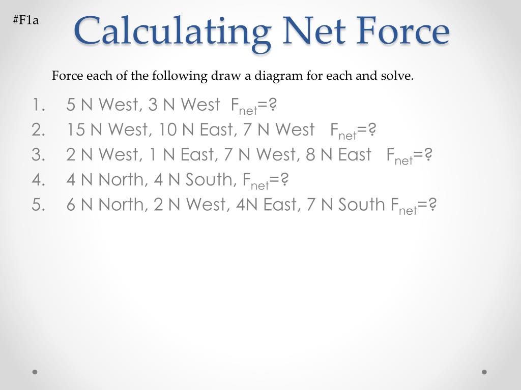 Calculating Net Force #F1a Force each of the following draw a diagram for each and solve. • 5 N West, 3 N West Fnet=? • 15 N West, 10 N East, 7 N West Fnet=? • 2 N West, 1 N East, 7 N West, 8 N East Fnet=? • 4 N North, 4 N South, Fnet=? • 6 N North, 2 N West, 4N East, 7 N South Fnet=?