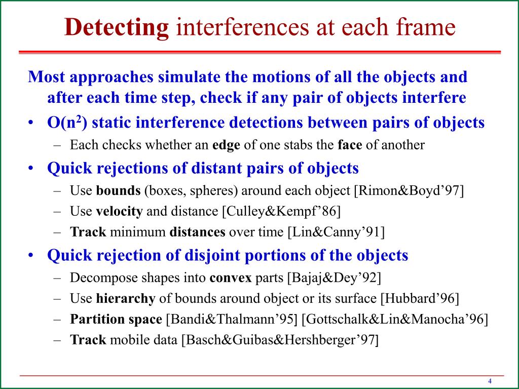 Detecting interferences at each frame Most approaches simulate the motions of all the objects and after each time step, check if any pair of objects interfere • O(n2) static interference detections between pairs of objects • Each checks whether an edge of one stabs the face of another • Quick rejections of distant pairs of objects • Use bounds (boxes, spheres) around each object [Rimon&Boyd’97] • Use velocity and distance [Culley&Kempf’86] • Track minimum distances over time [Lin&Canny’91] • Quick rejection of disjoint portions of the objects • Decompose shapes into convex parts [Bajaj&Dey’92] • Use hierarchy of bounds around object or its surface [Hubbard’96] • Partitionspace [Bandi&Thalmann’95][Gottschalk&Lin&Manocha’96] • Track mobile data [Basch&Guibas&Hershberger’97]