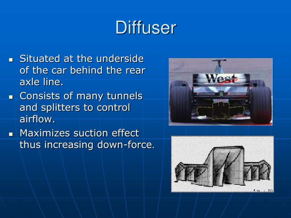 Diffuser • Situated at the underside of the car behind the rear axle line. • Consists of many tunnels and splitters to control airflow. • Maximizes suction effect thus increasing down-force.