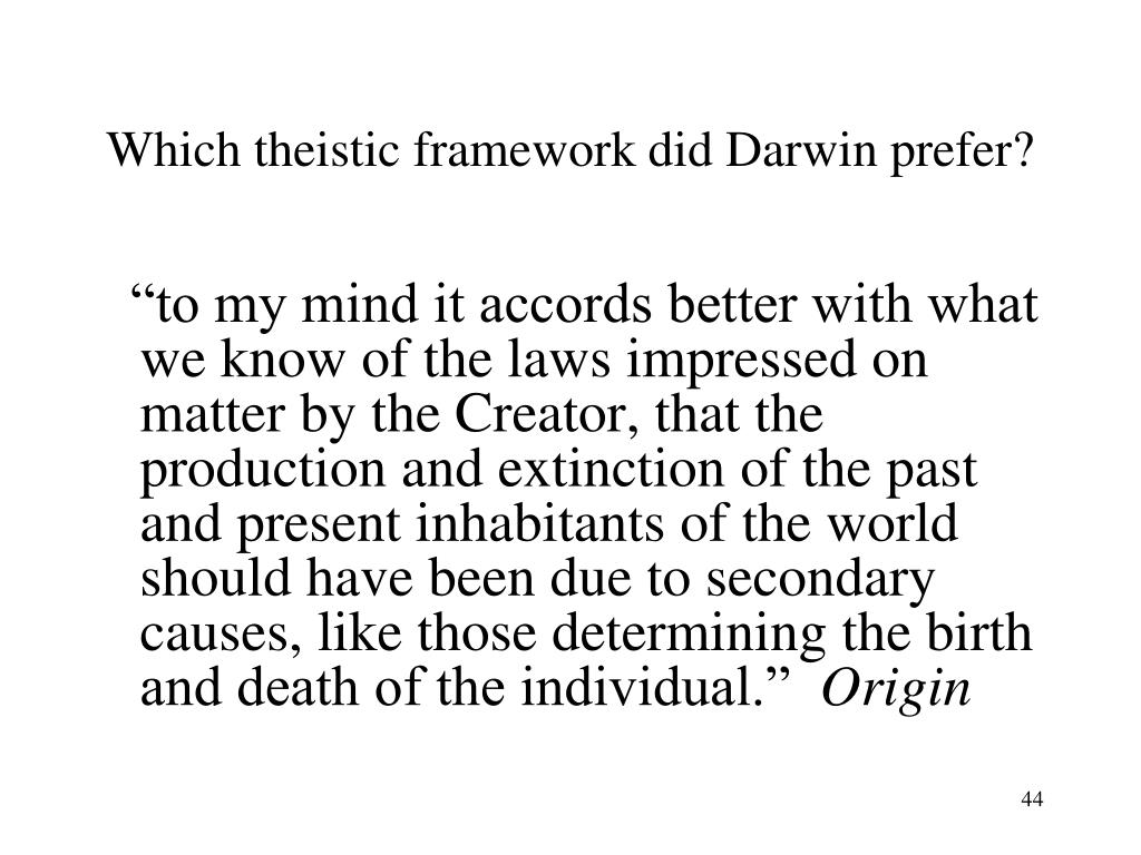 Which theistic framework did Darwin prefer? “to my mind it accords better with what we know of the laws impressed on matter by the Creator, that the production and extinction of the past and present inhabitants of the world should have been due to secondary causes, like those determining the birth and death of the individual.” Origin