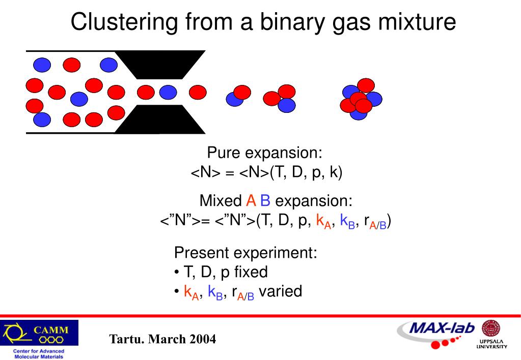 Clustering from a binary gas mixture Pure expansion: <N> = <N>(T, D, p, k) Mixed AB expansion: <”N”>= <”N”>(T, D, p, kA, kB, rA/B) • Present experiment: • T, D, p fixed • kA, kB, rA/B varied