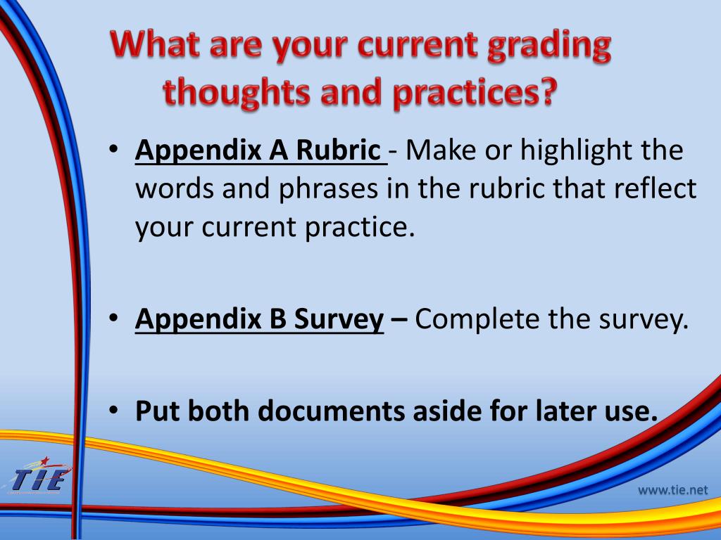 What are your current grading thoughts and practices? • Appendix A Rubric - Make or highlight the words and phrases in the rubric that reflect your current practice. • Appendix B Survey – Complete the survey. • Put both documents aside for later use.
