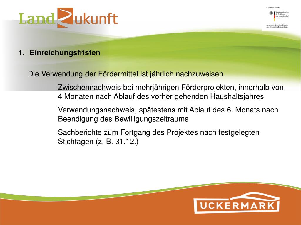 Einreichungsfristen Die Verwendung der Fördermittel ist jährlich nachzuweisen. Zwischennachweis bei mehrjährigen Förderprojekten, innerhalb von 4 Monaten nach Ablauf des vorher gehenden Haushaltsjahres Verwendungsnachweis, spätestens mit Ablauf des 6. Monats nach Beendigung des Bewilligungszeitraums Sachberichte zum Fortgang des Projektes nach festgelegten Stichtagen (z. B. 31.12.)
