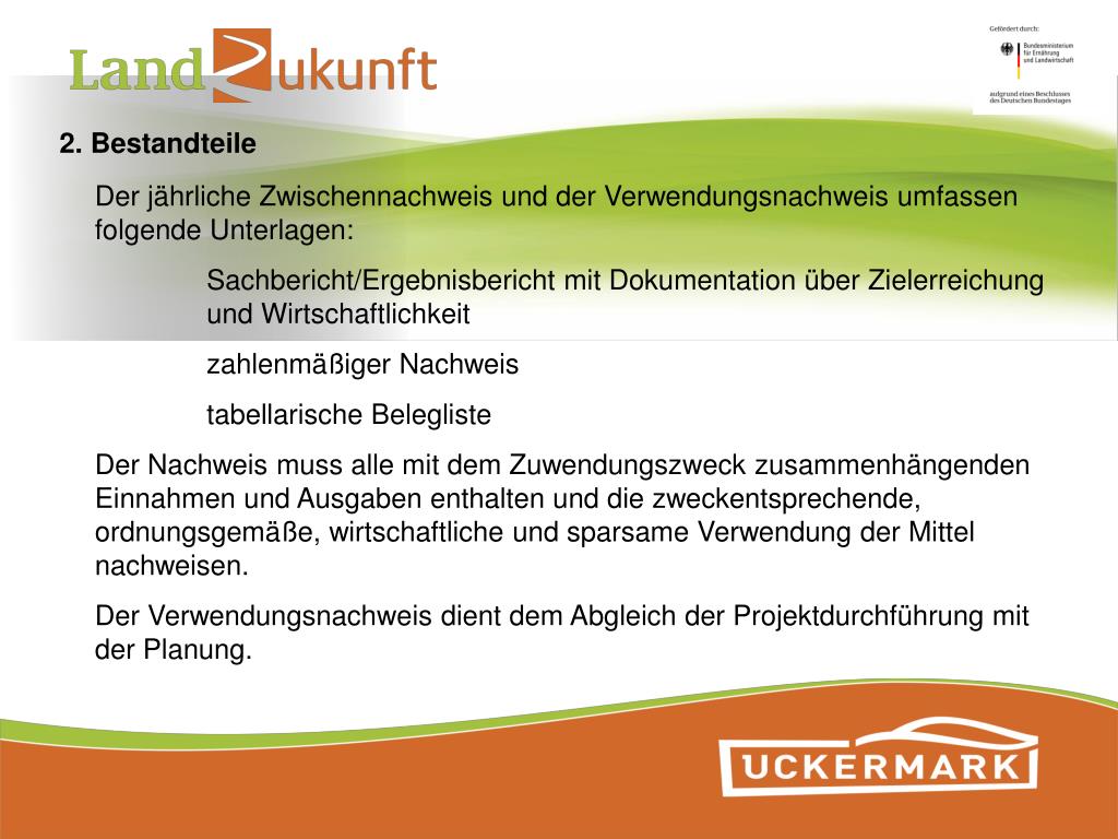 2. Bestandteile Der jährliche Zwischennachweis und der Verwendungsnachweis umfassen folgende Unterlagen: Sachbericht/Ergebnisbericht mit Dokumentation über Zielerreichung und Wirtschaftlichkeit zahlenmäßiger Nachweis tabellarische Belegliste Der Nachweis muss alle mit dem Zuwendungszweck zusammenhängenden Einnahmen und Ausgaben enthalten und die zweckentsprechende, ordnungsgemäße, wirtschaftliche und sparsame Verwendung der Mittel nachweisen. Der Verwendungsnachweis dient dem Abgleich der Projektdurchführung mit der Planung.