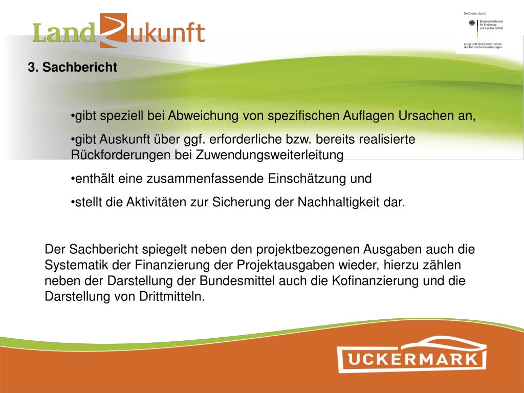 3. Sachbericht • gibt speziell bei Abweichung von spezifischen Auflagen Ursachen an, • gibt Auskunft über ggf. erforderliche bzw. bereits realisierte Rückforderungen bei Zuwendungsweiterleitung • enthält eine zusammenfassende Einschätzung und • stellt die Aktivitäten zur Sicherung der Nachhaltigkeit dar. • Der Sachbericht spiegelt neben den projektbezogenen Ausgaben auch die Systematik der Finanzierung der Projektausgaben wieder, hierzu zählen neben der Darstellung der Bundesmittel auch die Kofinanzierung und die Darstellung von Drittmitteln.