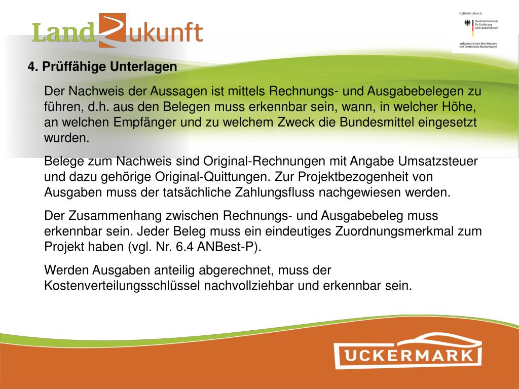 Modellvorhaben LandZukunft 2. Mitmach - Workshop Verwendungsnachweisführung und Sachbericht am 13.02.2014 in Prenzlau. Gliederung. Einreichungsfristen Bestandteile Sachbericht Prüffähige Unterlagen Beleglisten, Belegführung Vor Ort Prüfungen Mitteilungspflichten. Gliederung.