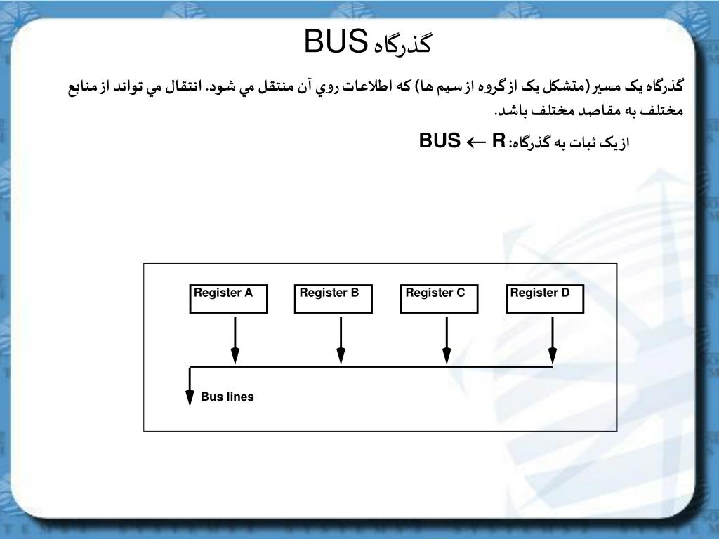 Register A Register B Register C Register D Bus lines BUSگذرگاه گذرگاه يک مسير(متشکل يک از گروه از سيم ها) که اطلاعات روي آن منتقل مي شود. انتقال مي تواند از منابع مختلف به مقاصد مختلف باشد. از يک ثبات به گذرگاه: BUS R