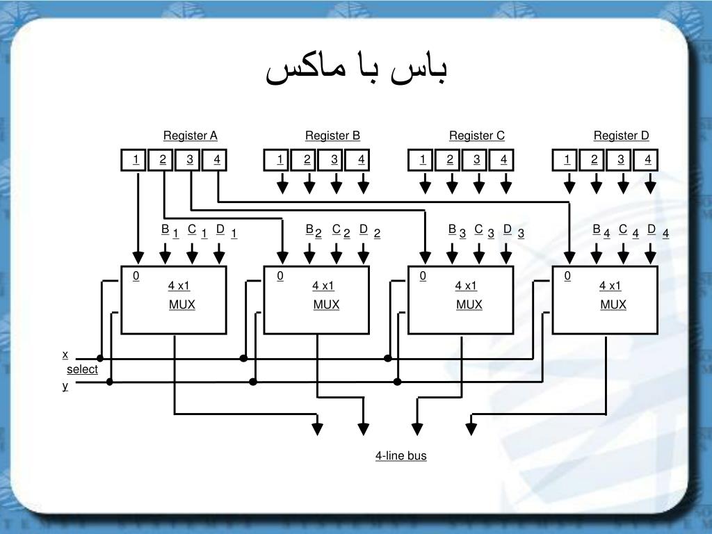 Register A Register B Register C Register D 1 2 3 4 1 2 3 4 1 2 3 4 1 2 3 4 B C D B C D B C D B C D 1 1 1 2 2 2 3 3 3 4 4 4 0 0 0 0 4 x1 4 x1 4 x1 4 x1 MUX MUX MUX MUX x select y 4-line bus باس با ماکس