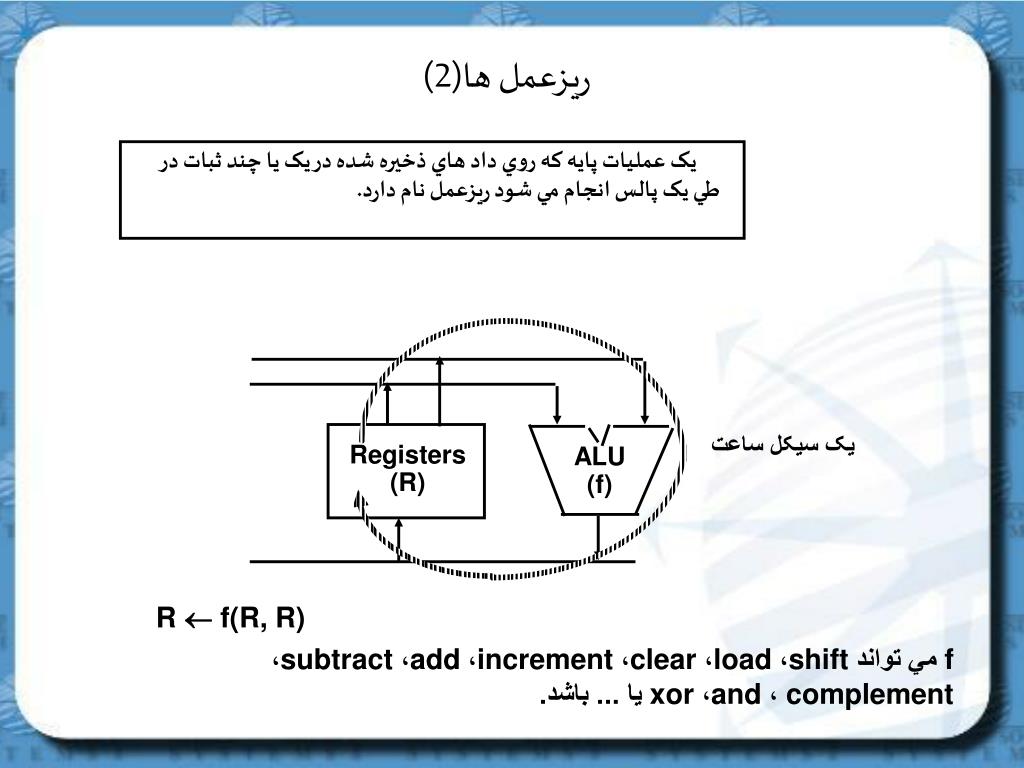 Registers (R) ALU (f) ريزعمل ها(2) يک عمليات پايه که روي داد هاي ذخيره شده در يک يا چند ثبات در طي يک پالس انجام مي شود ريزعمل نام دارد. يک سيکل ساعت R f(R, R) f مي تواند shift، load، clear، increment، add، subtract، complement، and، xor يا ... باشد.