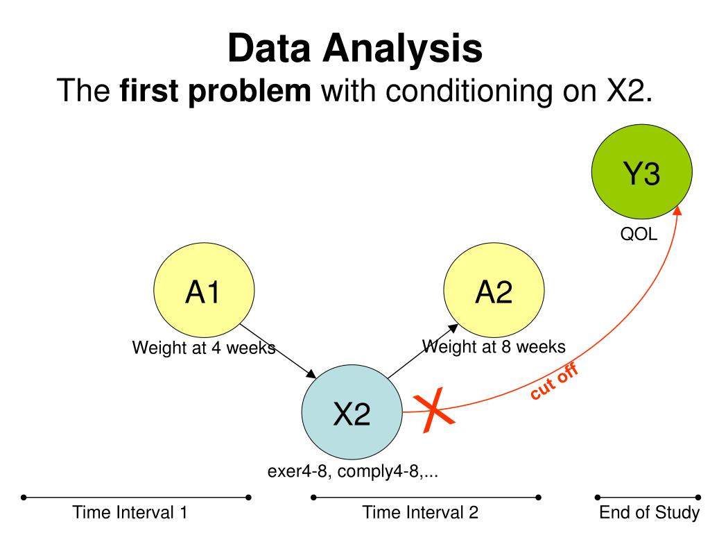 Data AnalysisThe first problem with conditioning on X2. Y3 QOL A1 A2 Weight at 8 weeks Weight at 4 weeks cut off X X2 exer4-8, comply4-8,... Time Interval 1 Time Interval 2 End of Study
