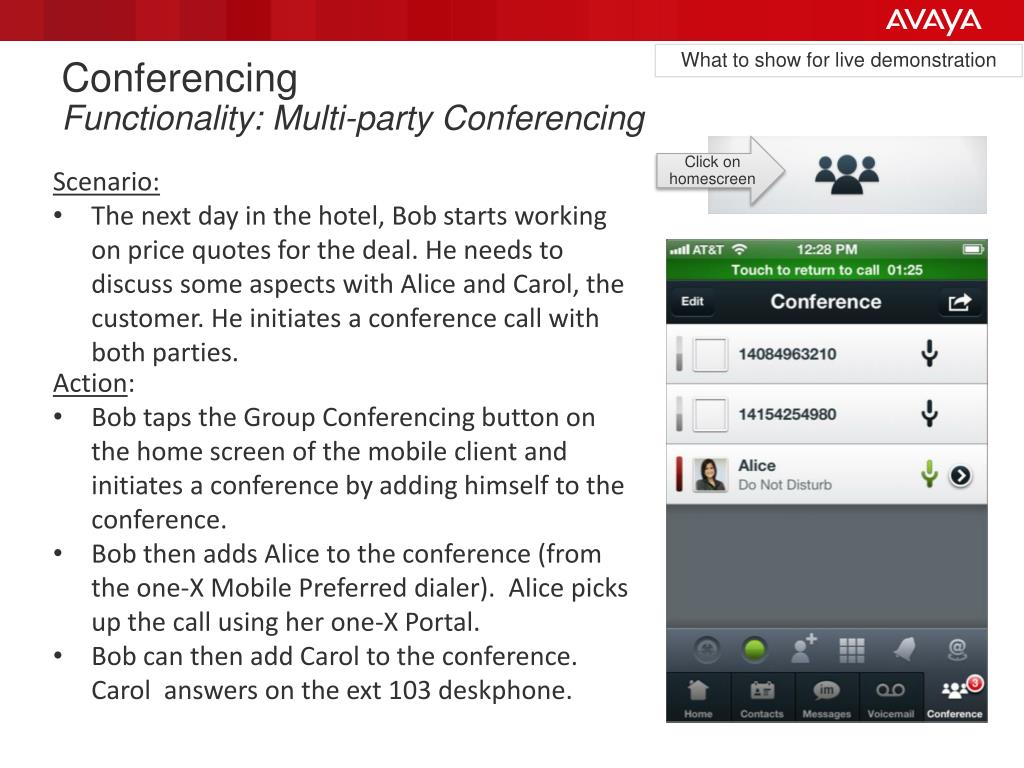 What to show for live demonstration Conferencing Functionality: Multi-party Conferencing Click on homescreen • Scenario: • The next day in the hotel, Bob starts working on price quotes for the deal. He needs to discuss some aspects with Alice and Carol, the customer. He initiates a conference call with both parties. • Action: • Bob taps the Group Conferencing button on the home screen of the mobile client and initiates a conference by adding himself to the conference. • Bob then adds Alice to the conference (from the one-X Mobile Preferred dialer). Alice picks up the call using her one-X Portal. • Bob can then add Carol to the conference. Carol answers on the ext 103 deskphone.