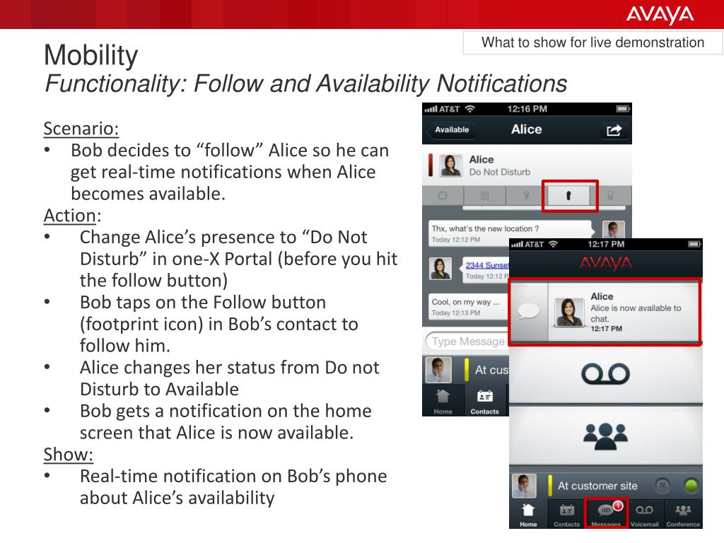 What to show for live demonstration MobilityFunctionality: Follow and Availability Notifications • Scenario: • Bob decides to “follow” Alice so he can get real-time notifications when Alice becomes available. • Action: • Change Alice’s presence to “Do Not Disturb” in one-X Portal (before you hit the follow button) • Bob taps on the Follow button (footprint icon) in Bob’s contact to follow him. • Alice changes her status from Do not Disturb to Available • Bob gets a notification on the home screen that Alice is now available. • Show: • Real-time notification on Bob’s phone about Alice’s availability