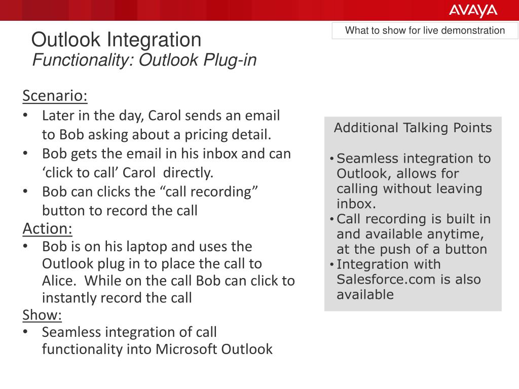 What to show for live demonstration Outlook Integration Functionality: Outlook Plug-in • Scenario: • Later in the day, Carol sends an email to Bob asking about a pricing detail. • Bob gets the email in his inbox and can ‘click to call’ Carol directly. • Bob can clicks the “call recording” button to record the call • Action: • Bob is on his laptop and uses the Outlook plug in to place the call to Alice. While on the call Bob can click to instantly record the call • Show: • Seamless integration of call functionality into Microsoft Outlook • Additional Talking Points • Seamless integration to Outlook, allows for calling without leaving inbox. • Call recording is built in and available anytime, at the push of a button • Integration with Salesforce.com is also available