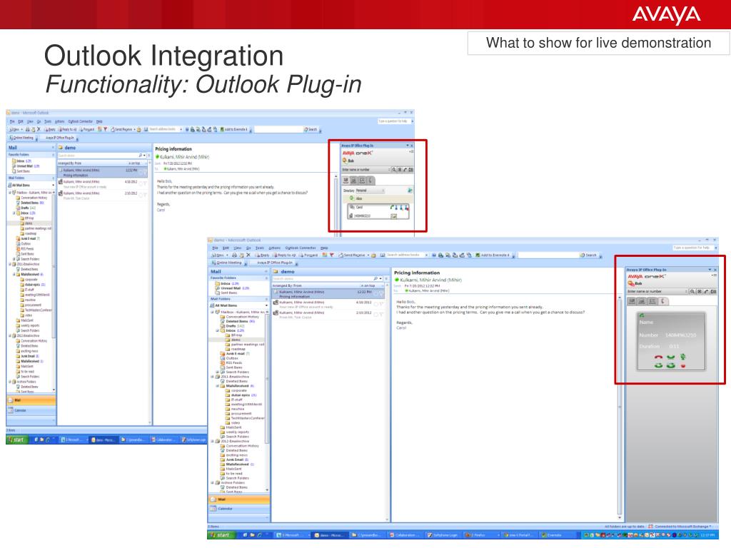 What to show for live demonstration Outlook Integration Functionality: Outlook Plug-in