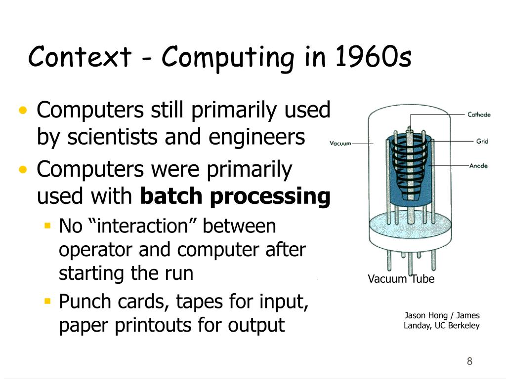 Context - Computing in 1960s • Computers still primarily used by scientists and engineers • Computers were primarily used with batch processing • No “interaction” between operator and computer after starting the run • Punch cards, tapes for input,paper printouts for output Vacuum Tube Jason Hong / James Landay, UC Berkeley
