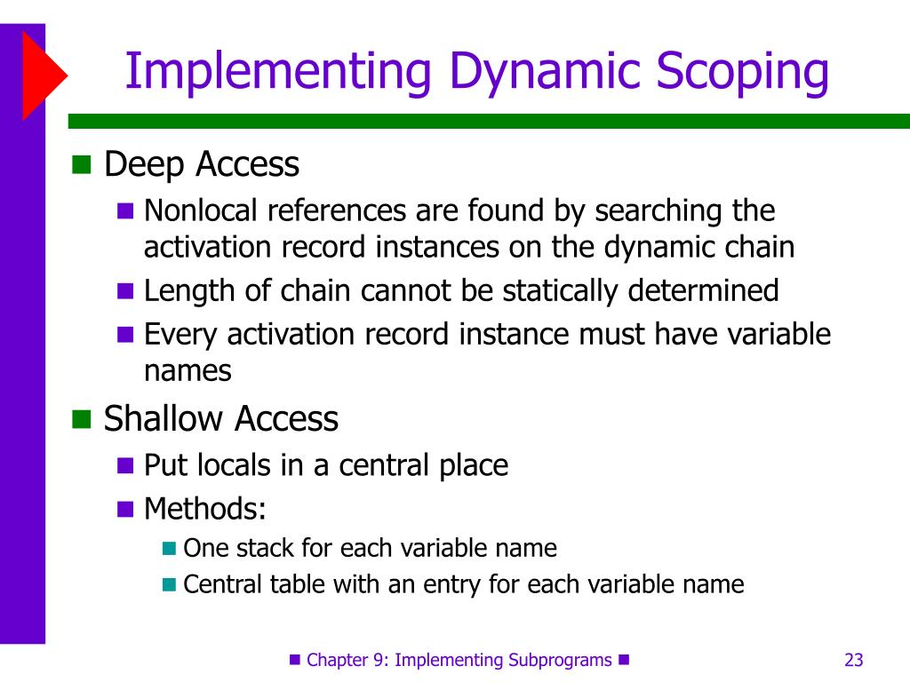 Implementing Dynamic Scoping • Deep Access • Nonlocal references are found by searching the activation record instances on the dynamic chain • Length of chain cannot be statically determined • Every activation record instance must have variable names • Shallow Access • Put locals in a central place • Methods: • One stack for each variable name • Central table with an entry for each variable name Chapter 9: Implementing Subprograms
