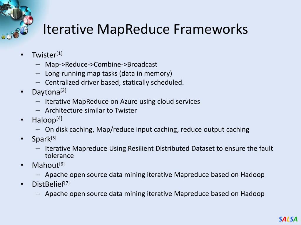 Iterative MapReduce Frameworks • Twister[1] • Map->Reduce->Combine->Broadcast • Long running map tasks (data in memory) • Centralized driver based, statically scheduled. • Daytona[3] • Iterative MapReduce on Azure using cloud services • Architecture similar to Twister • Haloop[4] • On disk caching, Map/reduce input caching, reduce output caching • Spark[5] • Iterative MapreduceUsing Resilient Distributed Dataset to ensure the fault tolerance • Mahout[6] • Apache open source data mining iterative Mapreduce based on Hadoop • DistBelief[7] • Apache open source data mining iterative Mapreduce based on Hadoop