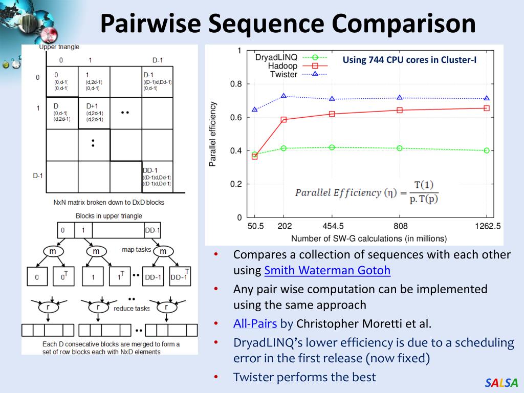 Pairwise Sequence Comparison Using 744 CPU cores in Cluster-I Compares a collection of sequences with each other using Smith Waterman Gotoh Any pair wise computation can be implemented using the same approach All-Pairs by Christopher Moretti et al. DryadLINQ’s lower efficiency is due to a scheduling error in the first release (now fixed) Twister performs the best