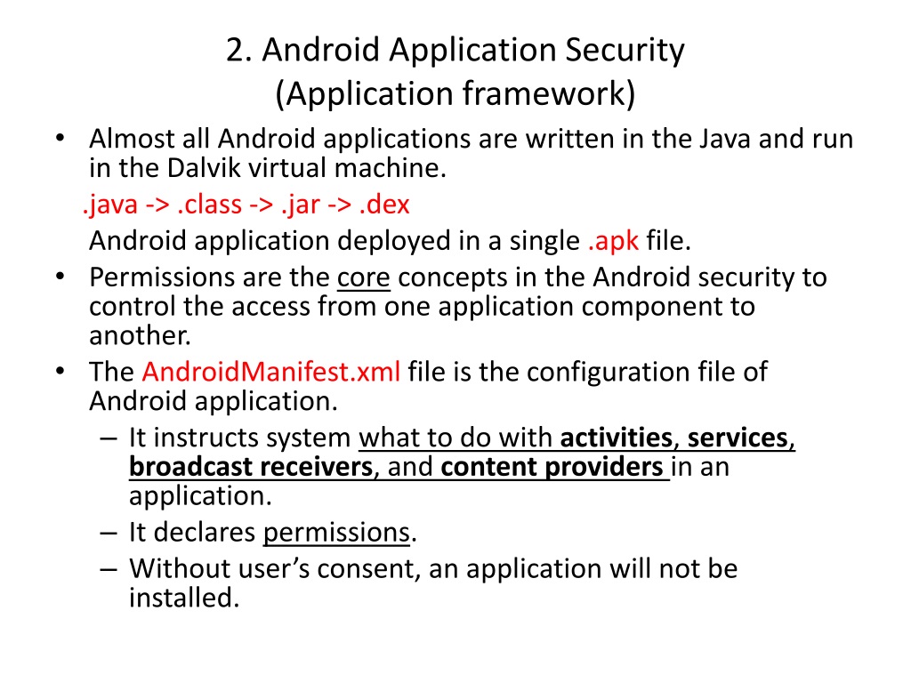 2. Android Application Security(Application framework) • Almost all Android applications are written in the Java and run in the Dalvik virtual machine. .java -> .class -> .jar -> .dex Android application deployed in a single .apkfile. • Permissions are the core concepts in the Android security to control the access from one application component to another. • The AndroidManifest.xml file is the configuration file of Android application. • It instructs system what to do with activities, services, broadcast receivers, and content providers in an application. • It declares permissions. • Without user’s consent, an application will not be installed.