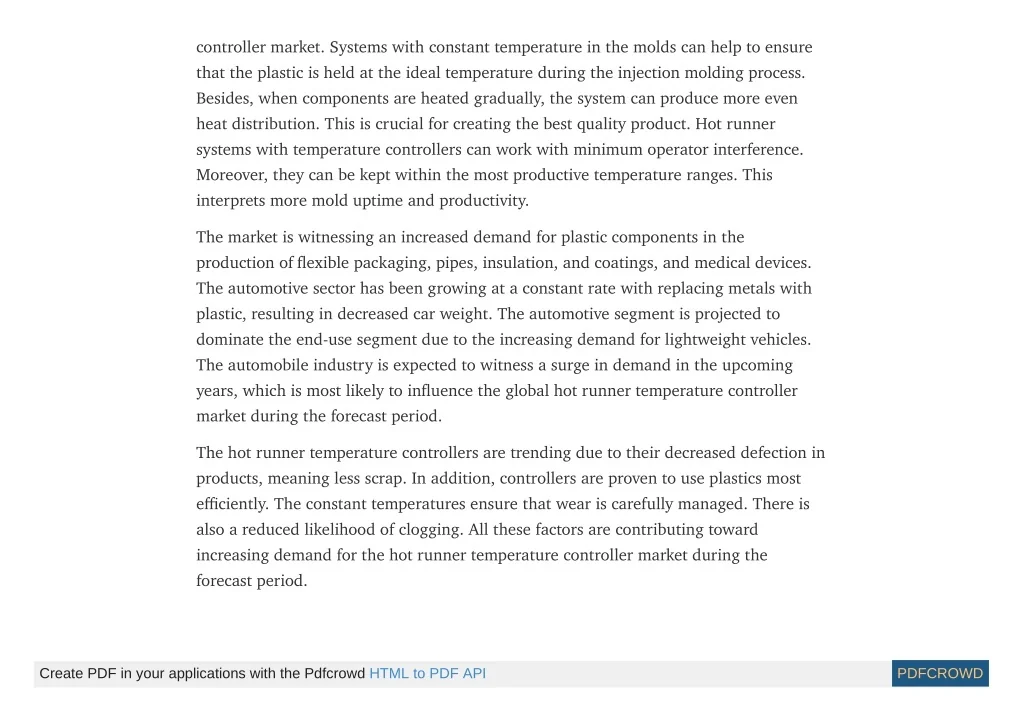 controller market. Systems with constant temperature in the molds can help to ensure that the plastic is held at the ideal temperature during the injection molding process. Besides, when components are heated gradually, the system can produce more even heat distribution. This is crucial for creating the best quality product. Hot runner systems with temperature controllers can work with minimum operator interference. Moreover, they can be kept within the most productive temperature ranges. This interprets more mold uptime and productivity. The market is witnessing an increased demand for plastic components in the production of flexible packaging, pipes, insulation, and coatings, and medical devices. The automotive sector has been growing at a constant rate with replacing metals with plastic, resulting in decreased car weight. The automotive segment is projected to dominate the end-use segment due to the increasing demand for lightweight vehicles. The automobile industry is expected to witness a surge in demand in the upcoming years, which is most likely to influence the global hot runner temperature controller market during the forecast period. The hot runner temperature controllers are trending due to their decreased defection in products, meaning less scrap. In addition, controllers are proven to use plastics most efficiently. The constant temperatures ensure that wear is carefully managed. There is also a reduced likelihood of clogging. All these factors are contributing toward increasing demand for the hot runner temperature controller market during the forecast period. Create PDF in your applications with the Pdfcrowd HTML to PDF API PDFCROWD