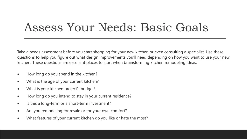 Assess Your Needs: Basic Goals Take a needs assessment before you start shopping for your new kitchen or even consulting a specialist. Use these questions to help you figure out what design improvements you’ll need depending on how you want to use your new kitchen. These questions are excellent places to start when brainstorming kitchen remodeling ideas. ·How long do you spend in the kitchen? ·What is the age of your current kitchen? ·What is your kitchen project’s budget? ·How long do you intend to stay in your current residence? ·Is this a long-term or a short-term investment? ·Are you remodeling for resale or for your own comfort? ·What features of your current kitchen do you like or hate the most?