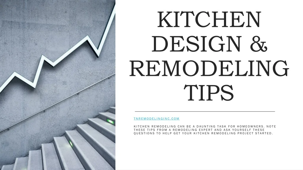 KITCHEN DESIGN & REMODELING TIPS Tnremodelinginc.com Kitchen Remodeling can be a daunting task for homeowners. Note these tips from a remodeling expert and ask yourself these questions to help get your kitchen remodeling project started.