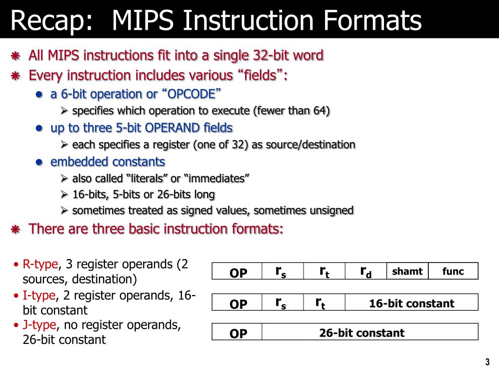 Recap: MIPS Instruction Formats rs rt rd OP rs rt OP 16-bit constant • All MIPS instructions fit into a single 32-bit word • Every instruction includes various “fields”: • a 6-bit operation or “OPCODE” • specifies which operation to execute (fewer than 64) • up to three 5-bit OPERAND fields • each specifies a register (one of 32) as source/destination • embedded constants • also called “literals” or “immediates” • 16-bits, 5-bits or 26-bits long • sometimes treated as signed values, sometimes unsigned • There are three basic instruction formats: • R-type, 3 register operands (2 sources, destination) shamt func • I-type, 2 register operands, 16-bit constant • J-type, no register operands, 26-bit constant OP 26-bit constant