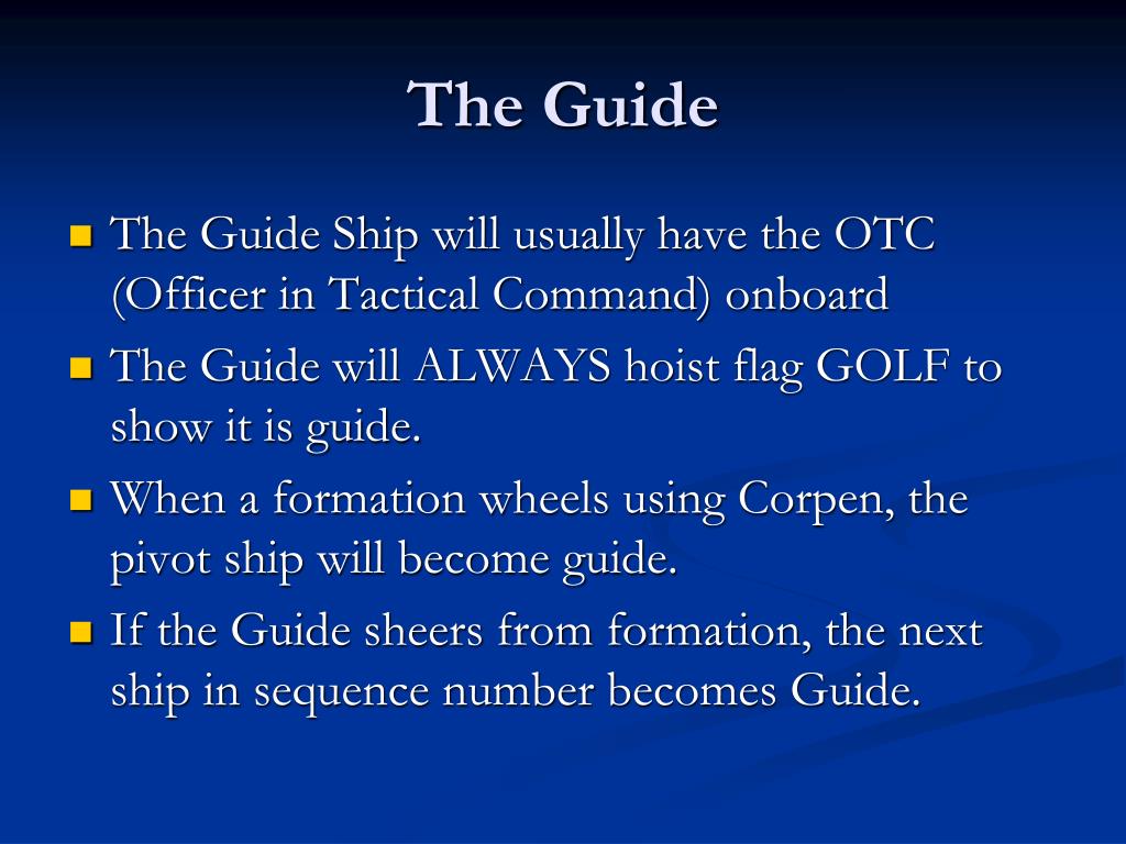 The Guide • The Guide Ship will usually have the OTC (Officer in Tactical Command) onboard • The Guide will ALWAYS hoist flag GOLF to show it is guide. • When a formation wheels using Corpen, the pivot ship will become guide. • If the Guide sheers from formation, the next ship in sequence number becomes Guide.