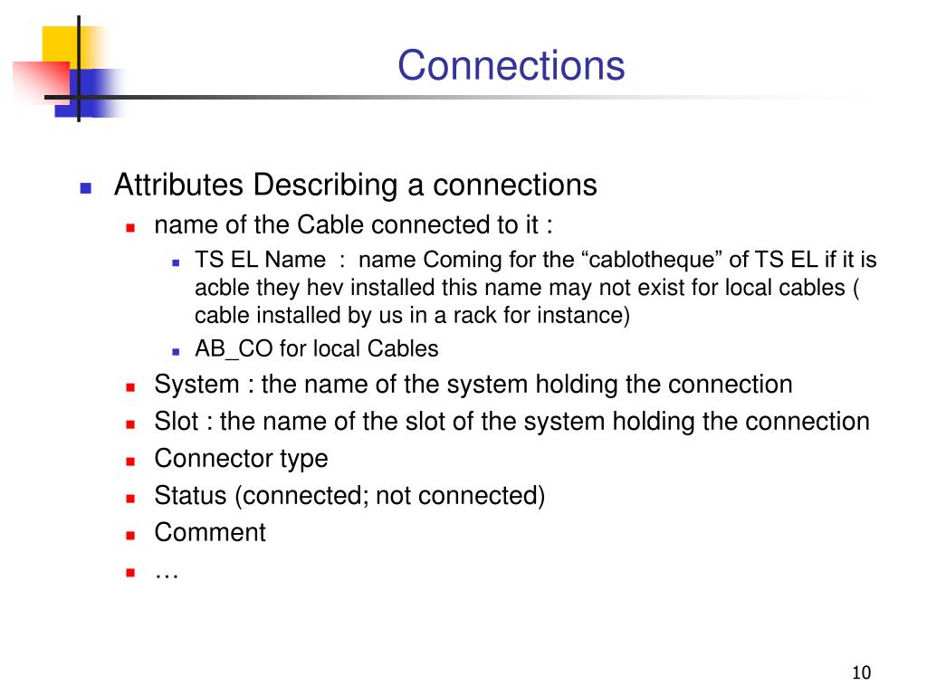 Connections • Attributes Describing a connections • name of the Cable connected to it : • TS EL Name : name Coming for the “cablotheque” of TS EL if it is acble they hev installed this name may not exist for local cables ( cable installed by us in a rack for instance) • AB_CO for local Cables • System : the name of the system holding the connection • Slot : the name of the slot of the system holding the connection • Connector type • Status (connected; not connected) • Comment • …