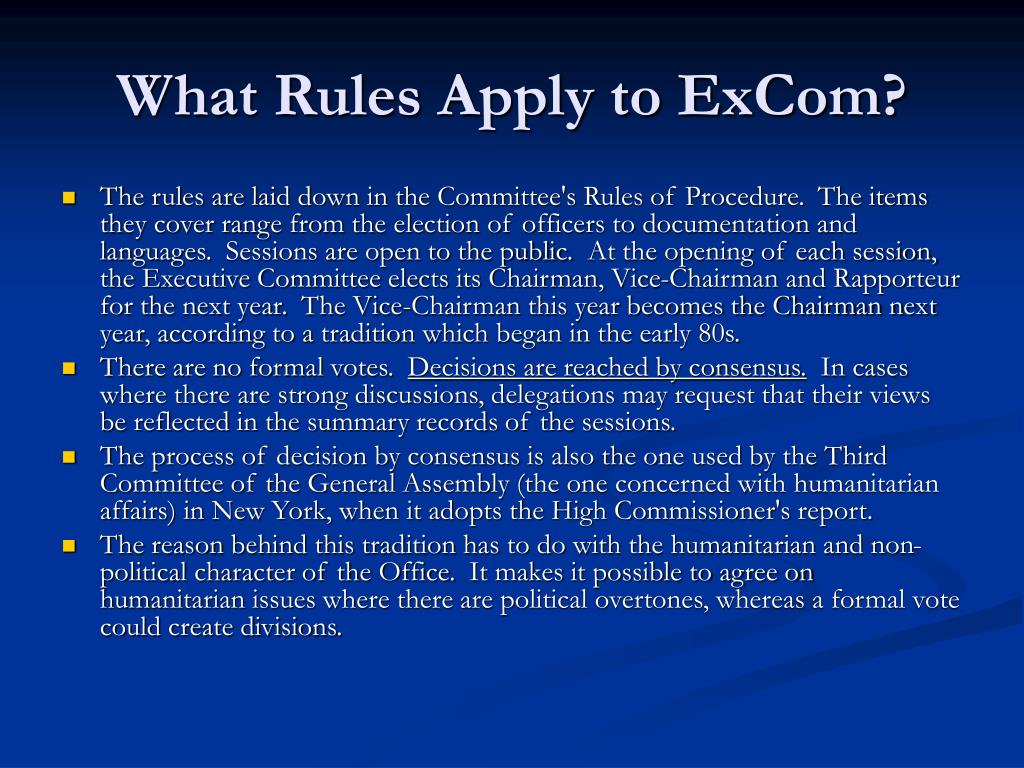 Annual Cycle of Meetings • ExCom is not a one-off event where states make decisions. It is part of a year-round cycle of meetings! • Feb/March Standing Committee (programme) • June Standing Committee (protection) • Sept Standing Committee (financial) • Oct ExCom Plenary Session (annual) • Dec Planning Meeting