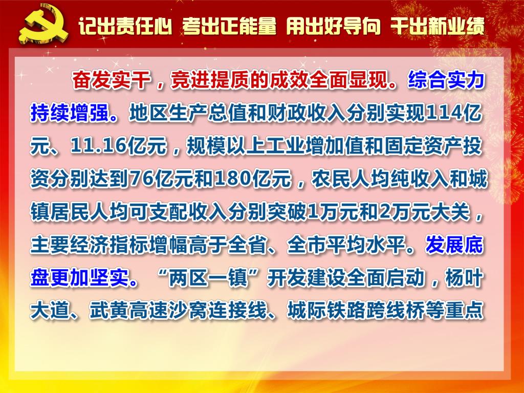 奋发实干,竞进提质的成效全面显现。综合实力持续增强。地区生产总值和财政收入分别实现114亿元、11.16亿元,规模以上工业增加值和固定资产投资分别达到76亿元和180亿元,农民人均纯收入和城镇居民人均可支配收入分别突破1万元和2万元大关,主要经济指标增幅高于全省、全市平均水平。发展底盘更加坚实。“两区一镇”开发建设全面启动,杨叶大道、武黄高速沙窝连接线、城际铁路跨线桥等重点奋发实干,竞进提质的成效全面显现。综合实力持续增强。地区生产总值和财政收入分别实现114亿元、11.16亿元,规模以上工业增加值和固定资产投资分别达到76亿元和180亿元,农民人均纯收入和城镇居民人均可支配收入分别突破1万元和2万元大关,主要经济指标增幅高于全省、全市平均水平。发展底盘更加坚实。“两区一镇”开发建设全面启动,杨叶大道、武黄高速沙窝连接线、城际铁路跨线桥等重点