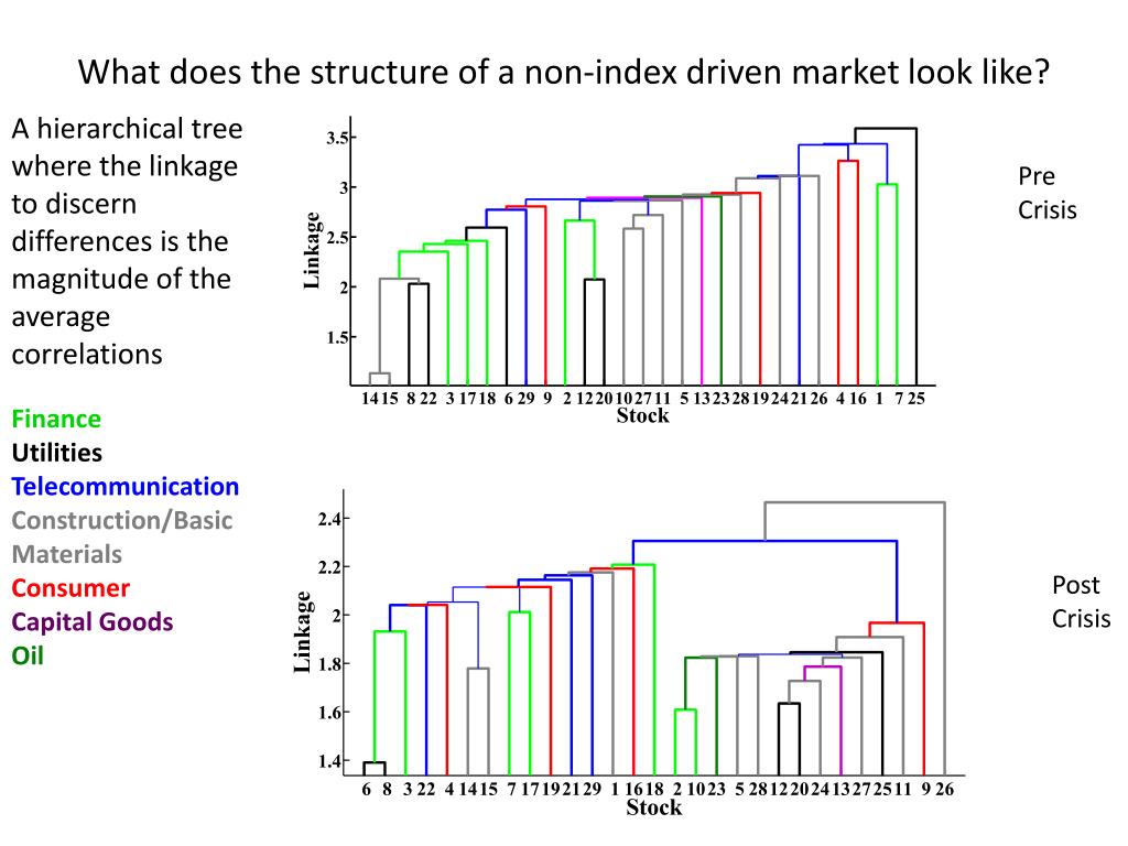 What does the structure of a non-index driven market look like? A hierarchical tree where the linkage to discern differences is the magnitude of the average correlations Pre Crisis Finance Utilities Telecommunications Construction/Basic Materials Consumer Capital Goods Oil Post Crisis