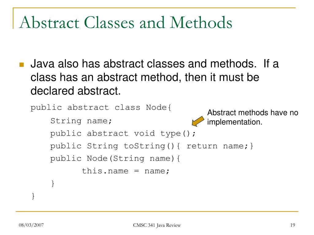 Abstract Classes and Methods • Java also has abstract classes and methods. If a class has an abstract method, then it must be declared abstract. public abstract class Node{ String name; public abstract void type(); public String toString(){ return name;} public Node(String name){ this.name = name; } } Abstract methods have no implementation. CMSC 341 Java Review