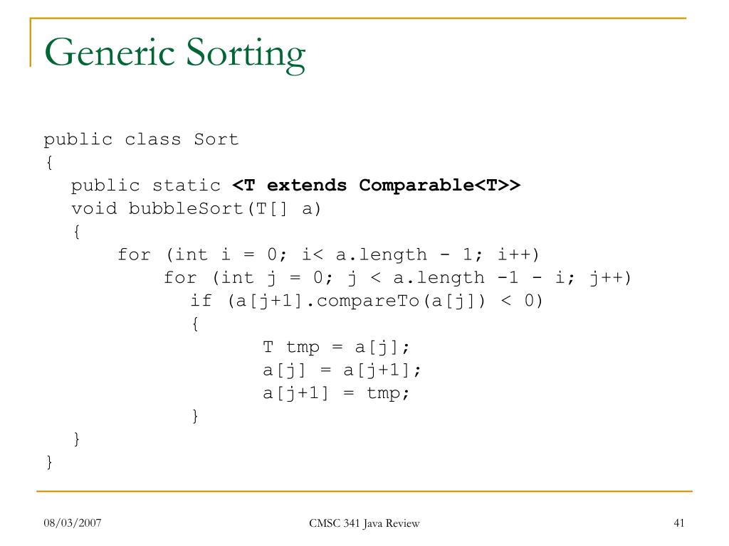 Generic Sorting (cont.) public class Sort { public static <T extends Comparable<? super T>> void bubbleSort(T[] a) { for (int i = 0; i< a.length - 1; i++) for (int j = 0; j < a.length -1 - i; j++) if (a[j+1].compareTo(a[j]) < 0) { T tmp = a[j]; a[j] = a[j+1]; a[j+1] = tmp; } } } CMSC 341 Java Review