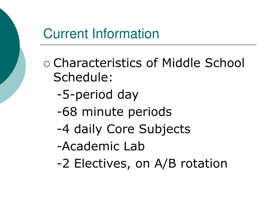 Current Information • Characteristics of Middle School Schedule: -5-period day -68 minute periods -4 daily Core Subjects -Academic Lab -2 Electives, on A/B rotation