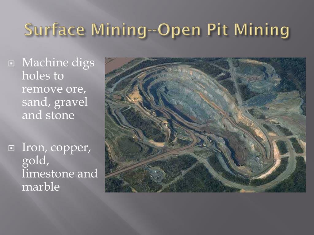 Surface Mining--Open Pit Mining • Machine digs holes to remove ore, sand, gravel and stone • Iron, copper, gold, limestone and marble