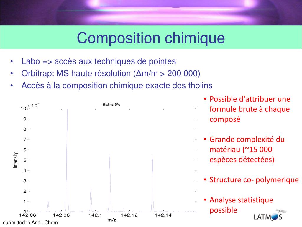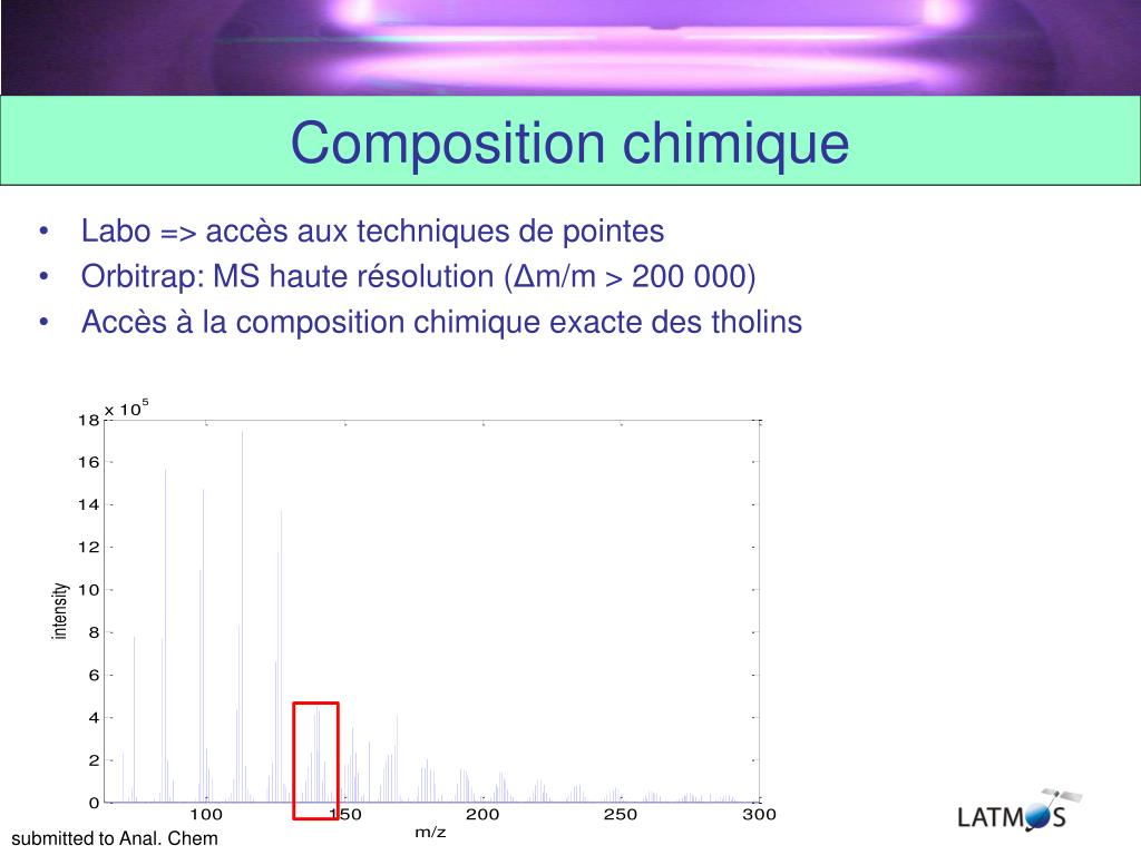 Composition chimique • Labo => accès aux techniques de pointes • Orbitrap: MS haute résolution (Δm/m > 200 000) • Accès à la composition chimique exacte des tholins submitted to Anal. Chem