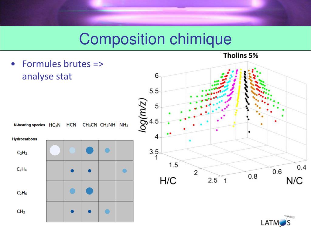 Composition chimique • Labo => accès aux techniques de pointes • Orbitrap: MS haute résolution (Δm/m > 200 000) • Accès à la composition chimique exacte des tholins • Possible d'attribuer une formule brute à chaque composé • Grande complexité du matériau (~15 000 espèces détectées) • Structure co- polymerique • Analyse statistique possible submitted to Anal. Chem