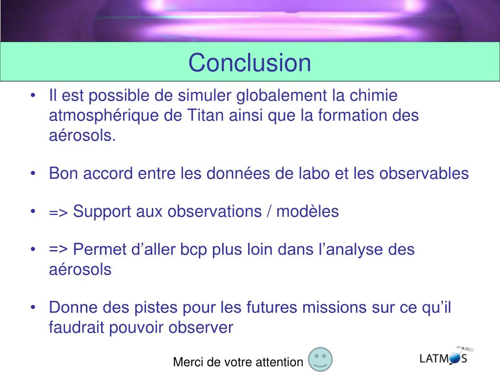 Conclusion • Il est possible de simuler globalement la chimie atmosphérique de Titan ainsi que la formation des aérosols. • Bon accord entre les données de labo et les observables • => Support aux observations / modèles • => Permet d’aller bcp plus loin dans l’analyse des aérosols • Donne des pistes pour les futures missions sur ce qu’il faudrait pouvoir observer Merci de votre attention