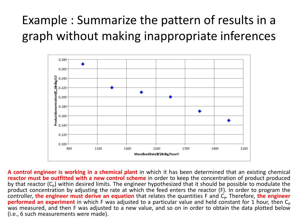 Example : Summarize the pattern of results in a graph without making inappropriate inferences A control engineer is working in a chemical plant in which it has been determined that an existing chemical reactor must be outfitted with a new control scheme in order to keep the concentration of product produced by that reactor (CP) within desired limits. The engineer hypothesized that it should be possible to modulate the product concentration by adjusting the rate at which the feed enters the reactor (F). In order to program the controller, the engineer must derive an equation that relates the quantities F and CP. Therefore, the engineer performed an experiment in which F was adjusted to a particular value and held constant for 1 hour, then CP was measured, and then F was adjusted to a new value, and so on in order to obtain the data plotted below (i.e., 6 such measurements were made).