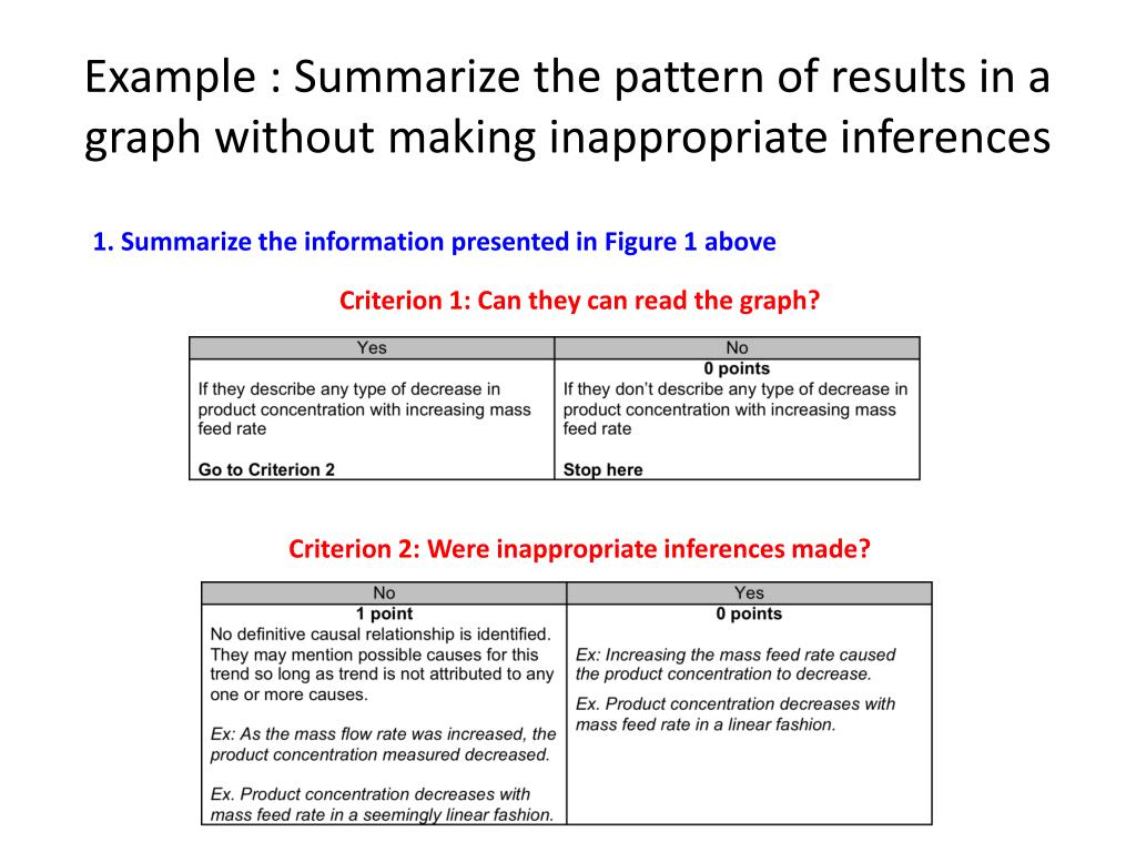 Example : Summarize the pattern of results in a graph without making inappropriate inferences 1. Summarize the information presented in Figure 1 above Criterion 1: Can they can read the graph? Criterion 2: Were inappropriate inferences made?
