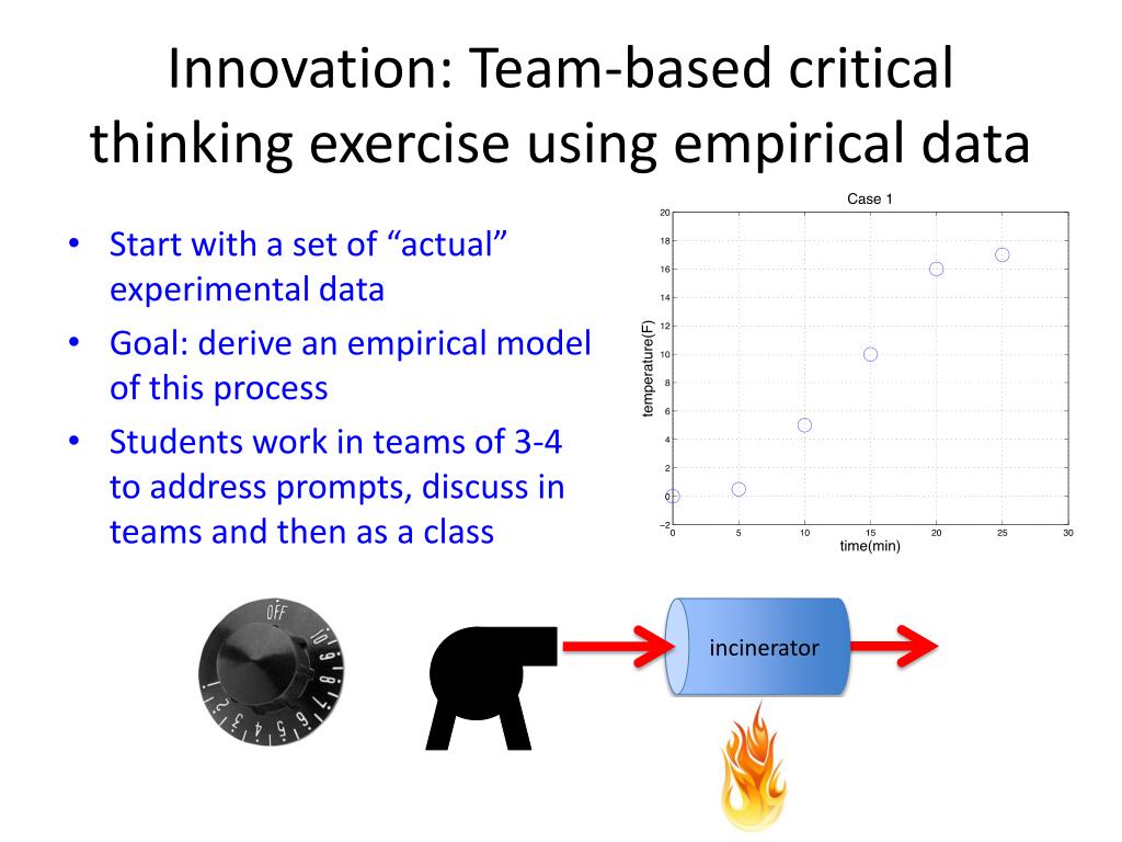 Innovation: Team-based critical thinking exercise using empirical data • Start with a set of “actual” experimental data • Goal: derive an empirical model of this process • Students work in teams of 3-4 to address prompts, discuss in teams and then as a class incinerator